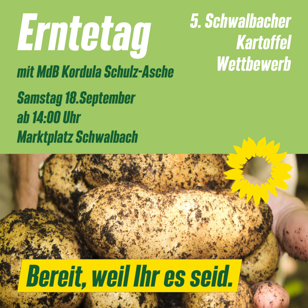 Treffpunkt ist um 14:00 Uhr am Marktplatz. Es wird pandemiebedingt wieder ein sehr einfaches Beisammensein werden, leider ohne das übliche Catering und zusammensitzen bei Grüner Soße und Apfel-Getränken. Aber auch dieses Jahr wird Kordula Schulz-Asche da sein und den Preis verleihen. Und wenn sie schon mal da ist, kann man spannende Gespräche mit ihr führen über die Arbeit im Bundestag und die wichtigen Projekte, die sie in der nächsten Legislaturperiode in Berlin für uns umsetzen will. Jede:r ist herzlich willkommen - mit und ohne Kartoffeln.